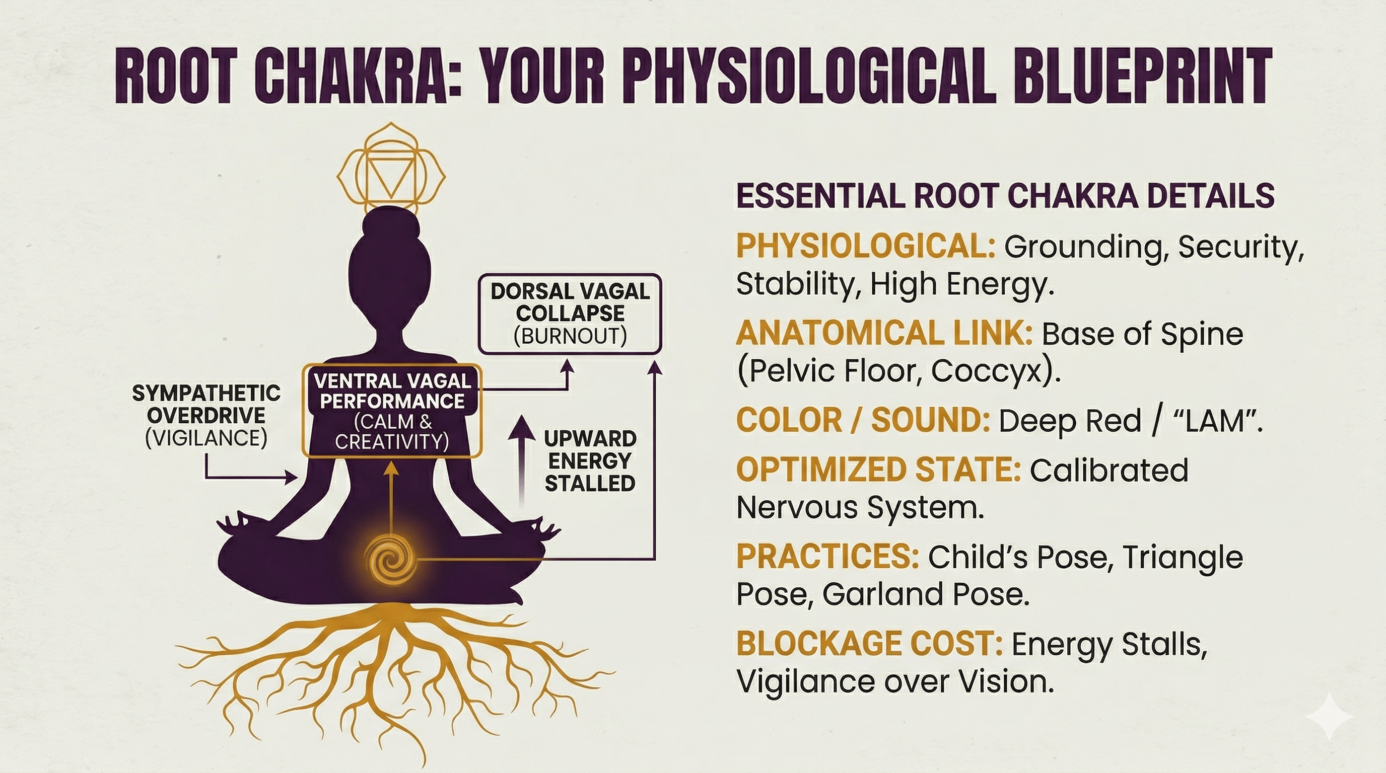 Caroline Myss, in Anatomy of the Spirit (Myss, 1996), describes the root chakra as governing what she calls tribal power: the body’s most fundamental operating assumption about whether life itself is safe, whether you belong, whether the ground will hold. This assumption forms before language. Before you had any capacity to evaluate it. And everything built above it, every goal, every relationship, every creative endeavor, inherits whatever instability is encoded there.