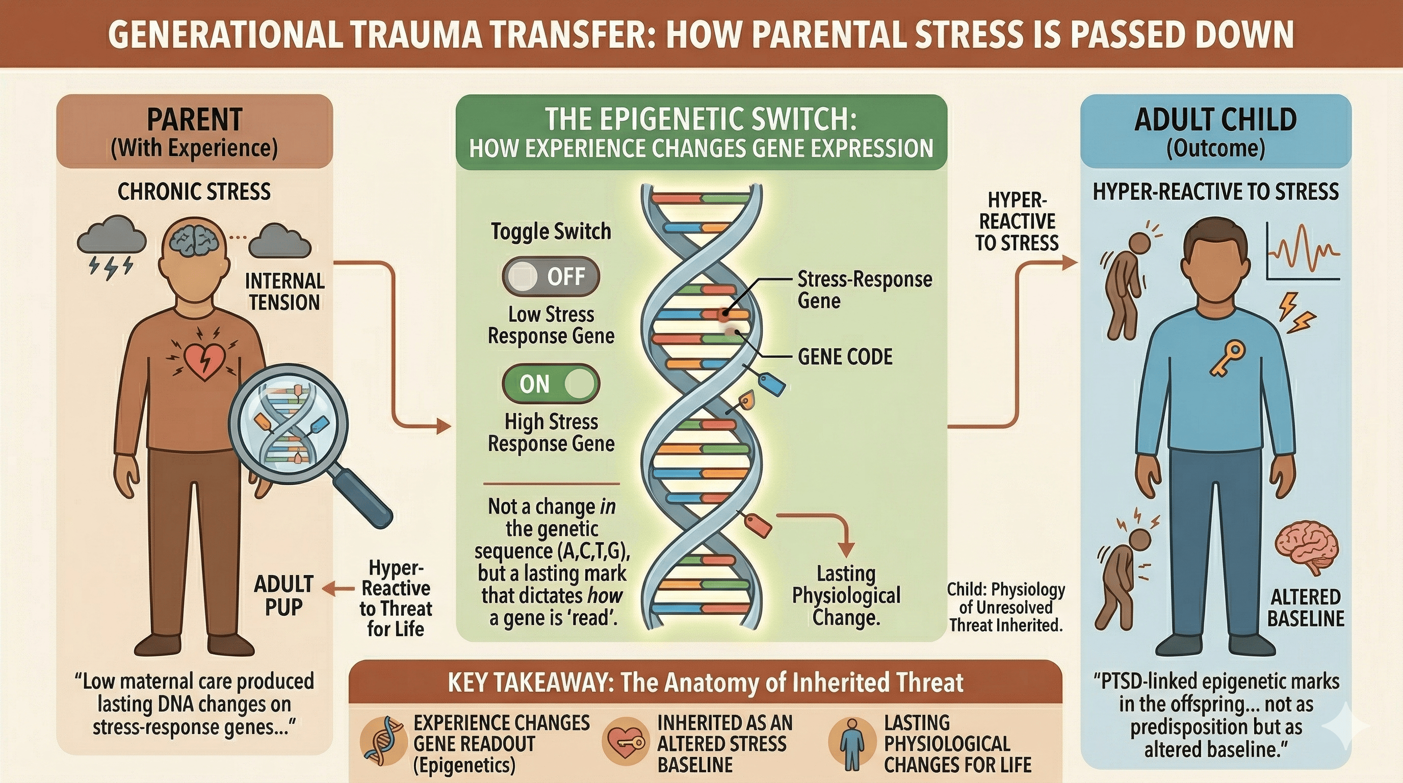 The encoding goes deeper still. Meaney’s (2001) rat studies showed that low maternal care produced lasting DNA changes on stress-response genes, making pups remain hyper-reactive to threat for life. Yehuda et al. (2016) found PTSD-linked epigenetic marks in the offspring of Holocaust survivors: the physiology of unresolved threat inherited by the next generation, not as predisposition but as altered baseline.