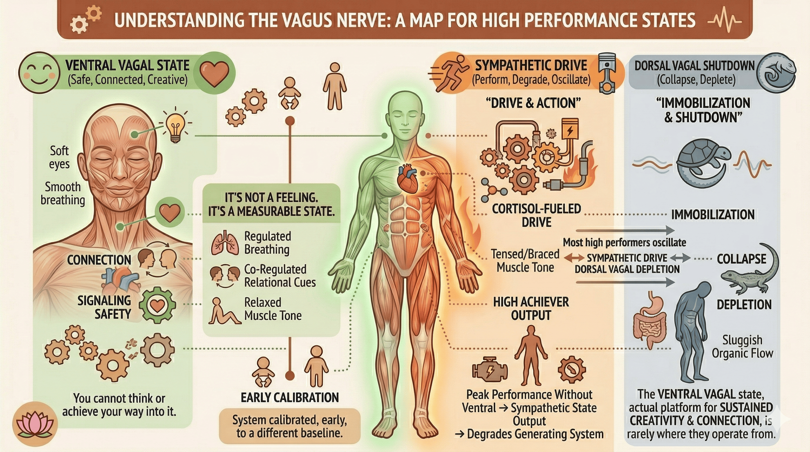 Most high performers oscillate between sympathetic drive and dorsal vagal depletion. The ventral vagal state, the actual neurological platform for sustained creativity and genuine connection, is rarely where they operate from. Not for lack of effort. Because the system was calibrated, early, to a different baseline.